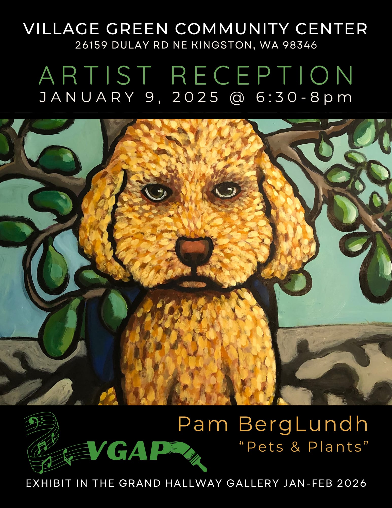 Join us in welcoming our latest artist to the Village Green Community Center Grand Hallway Art Gallery on Friday, January 9th at 6:30 pm. Local talent Pam Berglundh will showcase a beautiful collection of works featuring "Pets & Plants" for everyone to enjoy throughout January and February.