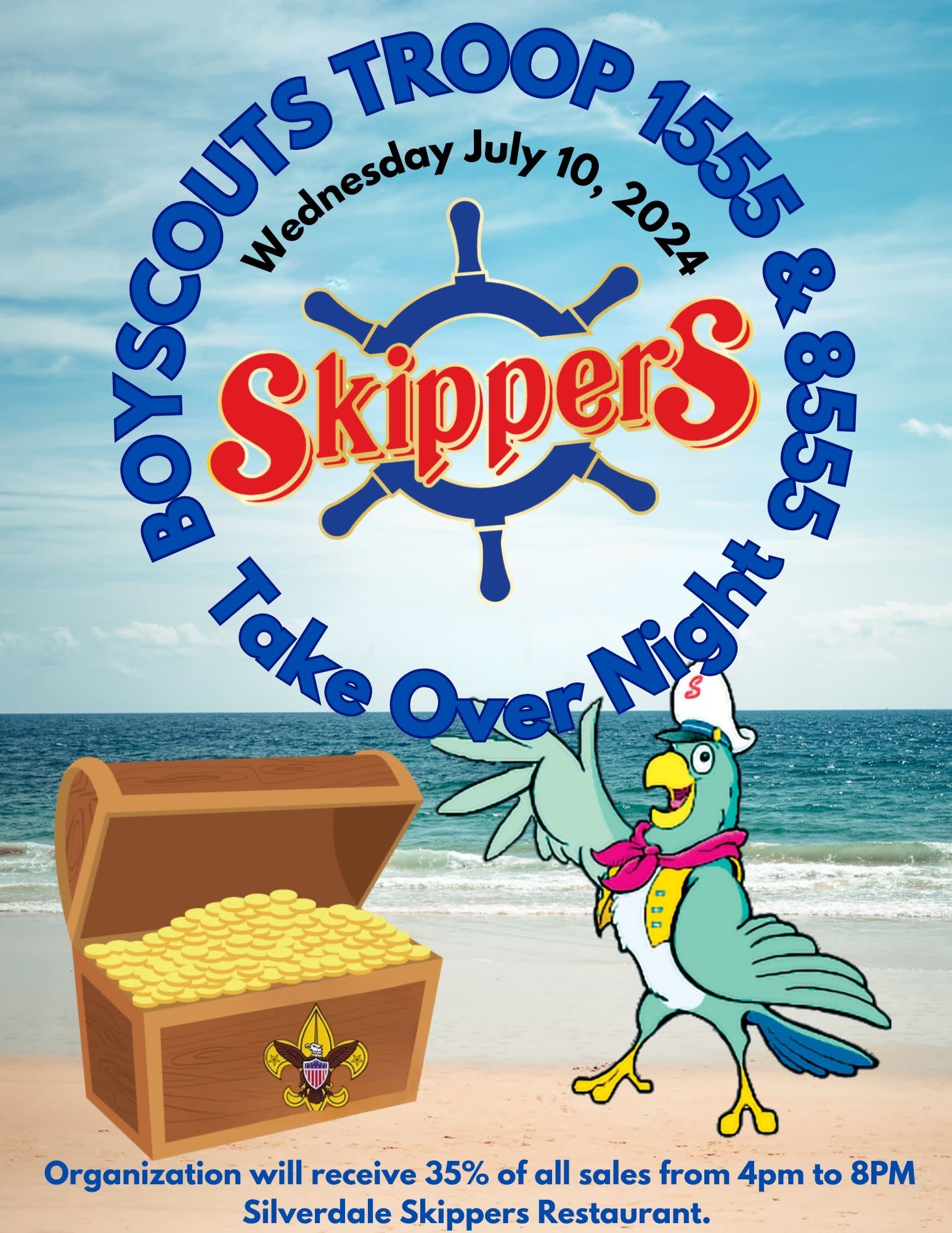 Please support Scout Troops 1555 & 8555 for a fundraiser at Skippers 4pm-8pm.Additional Info