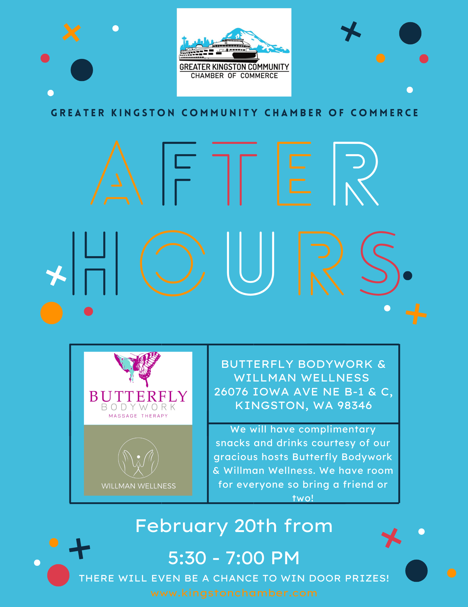 Join us for an evening of networking, relaxation, and fun at our Chamber After Hours event, hosted by Butterfly Bodywork and Willman Wellness! 🦋💆♀️