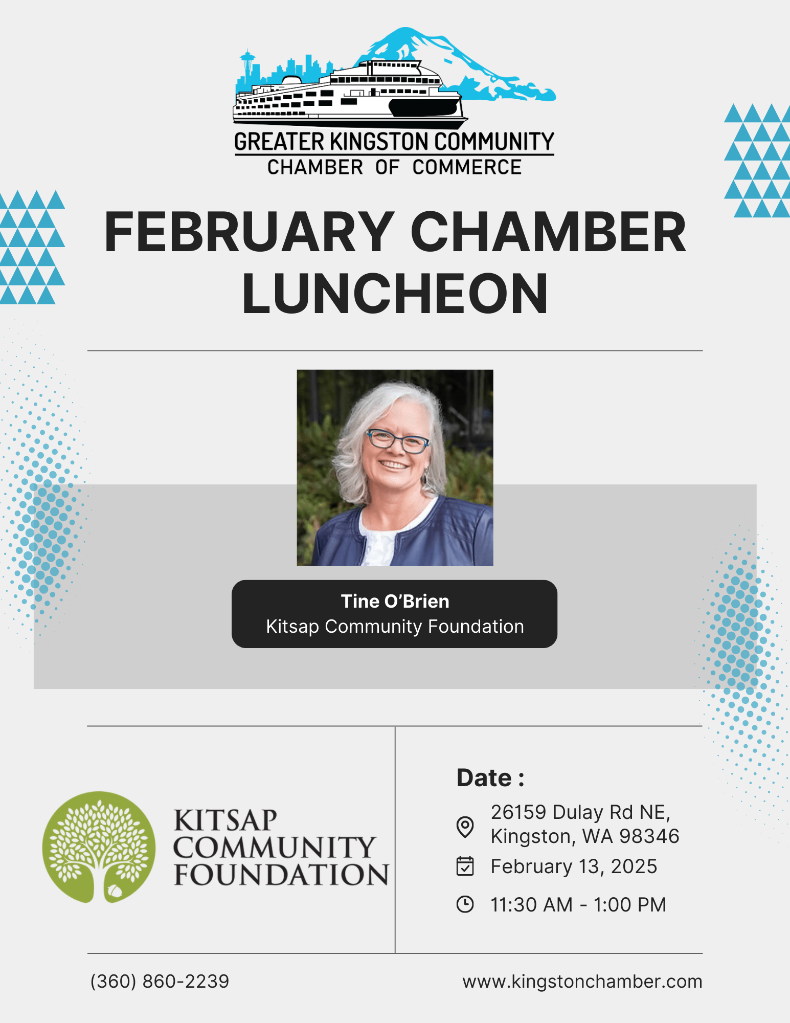 We are excited to welcome Tina O'Brien, Executive Director of the Kitsap Community Foundation, as our guest speaker at the upcoming Chamber Luncheon on February 6th. Tina has dedicated her career to strengthening Kitsap County’s nonprofit sector and is deeply involved in supporting initiatives that improve the well-being of our community. She brings a wealth of experience in community philanthropy and leadership and is passionate about making a lasting impact across the region.