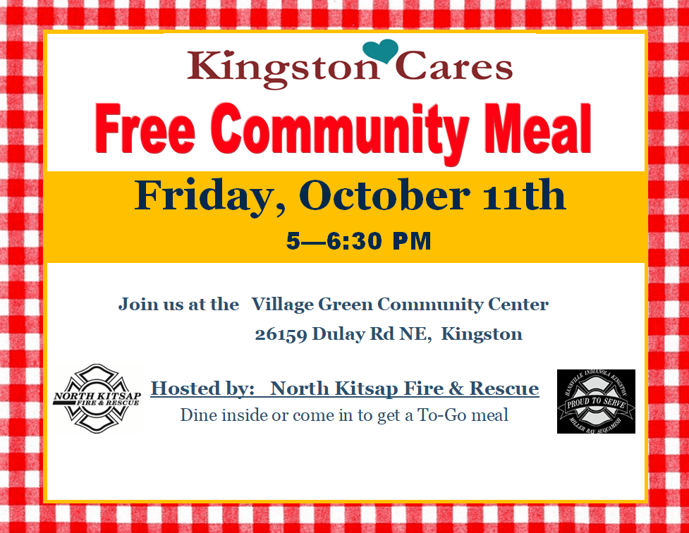 The Village Green Community Center is host to Kingston Cares' FREE Community Meal event which, on this occasion will be prepared and provided by the North Kitsap Fire & Rescue. This month's dinner will take place on October 11th and will be served inside the community center with an option to receive a To-Go meal for those who are unable to join us in the dining room.