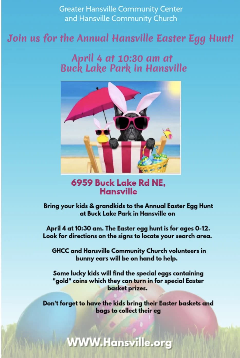 Bring your kids, grandkids, nieces, nephews... (ages 0-12) to the annual Hansville Easter Egg Hunt at Buck Lake Park. Saturday, April 4th at 10:30 am. Rain or shine! Follow directions on the signs to locate the search area. You will also find GHCC and Hansville Community Church volunteers wearing bunny ears standing by to help. Some lucky kids will find special eggs containing "gold" coins which they can turn in for Easter prizes! Don't forget your Easter baskets and bags for the hunt!