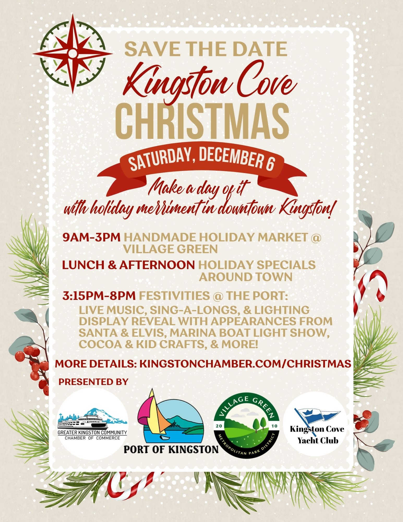 Join us Saturday, December 6th to kick off the holiday season with a full day of merriment! Starting at 9am with the Handcrafted Holiday Market at Village Green Community Center and continuing into the afternoon with special events, live music, kids events and lighting ceremony down at the Port of Kingston, you won't want to miss it! See kingstonchamber.com/christmas for more details!Additional Info