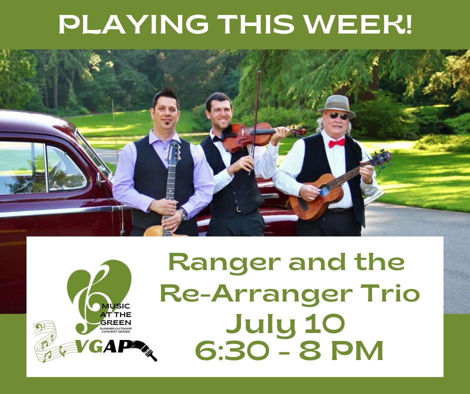 The musical series 'Music at the Green' will resume on Wednesday, July 10, at 6:30 PM. Bring a chair, invite a friend, and come enjoy the performance by Ranger and the Re-arrangers Trio.