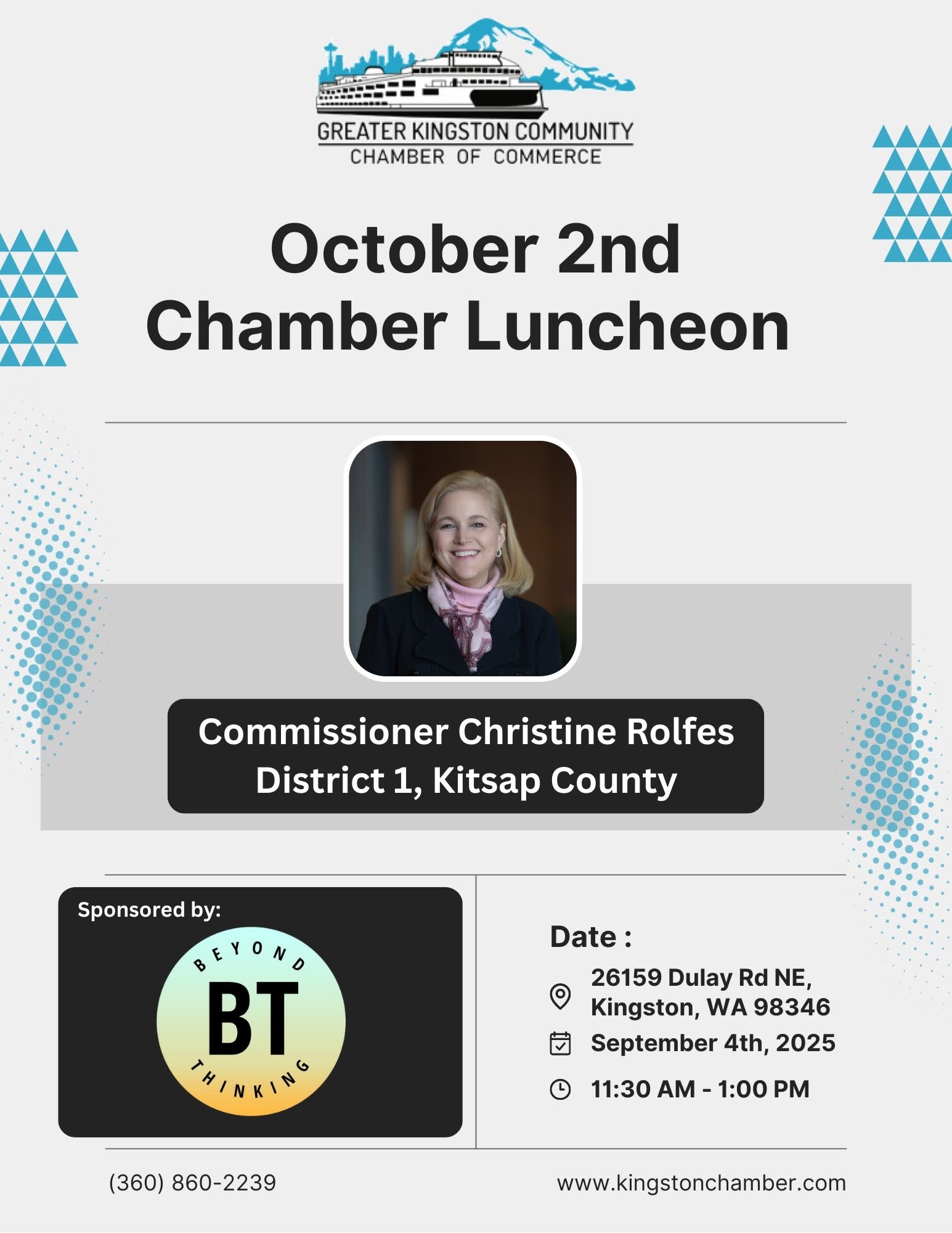 Our presenter for the October Chamber Luncheon is our Kitsap County Commissioner for District 1, Christine Rolfes.