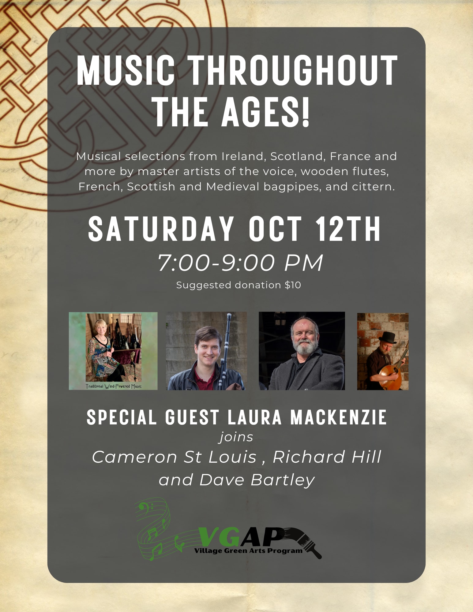 Enjoy musical selections from Ireland, Scotland, France, and beyond, performed by master vocalists and instrumentalists on wooden flutes, French, Scottish, and Medieval bagpipes, and cittern. Special Guest Laura MacKenzie will join Cameron St. Louis, Richard Hill, and David Bartley for an unforgettable experience.