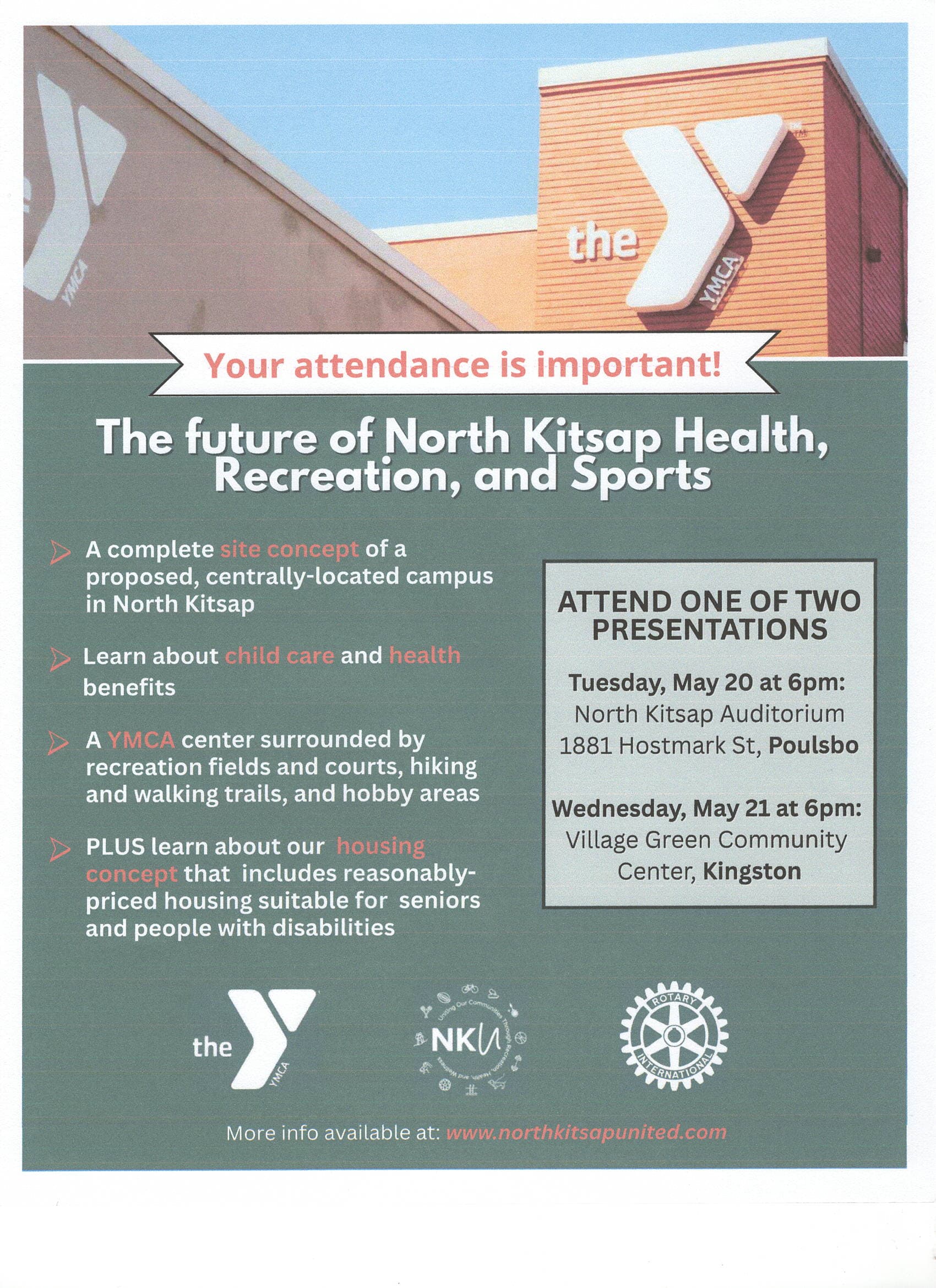 May 20 at 6 PM at North Kitsap Auditorium and May 21st at the Kingston Village Green, site plans shared for the health and recreation sites including the YMCA services, recreational fields, courts, trails, and hobby areas. Additionally, the housing concept plans for the area will be shared.
